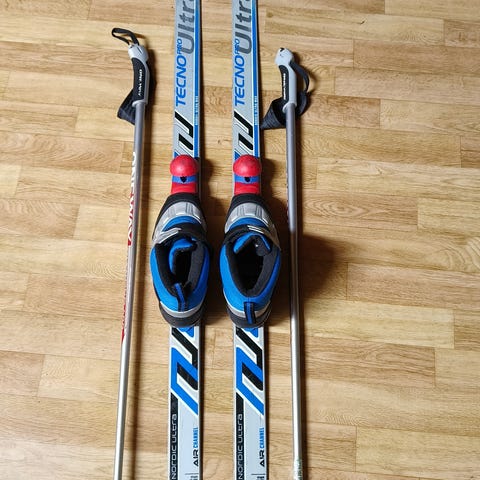 Myydään hyväkuntoinen suksipaketti lapselle perinteiseen hiihtoon. Kouluhiihto/koululiikunta/ hiihto.