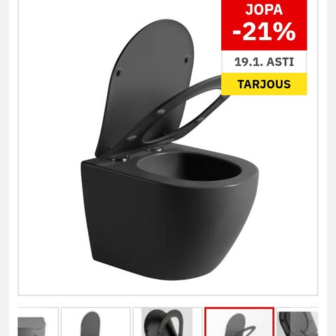 Arabian WC-istuin, jossa on istuinosa ja vesilukko. Soveltuu tavanomaiseen kotikäyttöön. Myytävänä myös muut kalusteet: suihkuseinä, allaskaappi + allas + hana bideineen sekä peilikaappi.