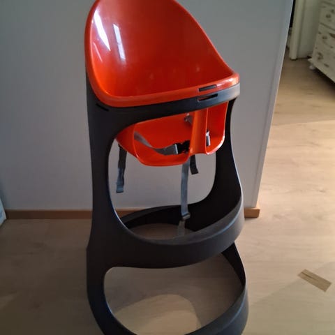 IKEA syöttötuoli, valkoinen väri, muovinen istuinosa ja metalliset irroitettavat jalat. Varustettu irrotettavalla tarjottimella ja turvavyöllä. Mukaan puhallettava pehmuste.