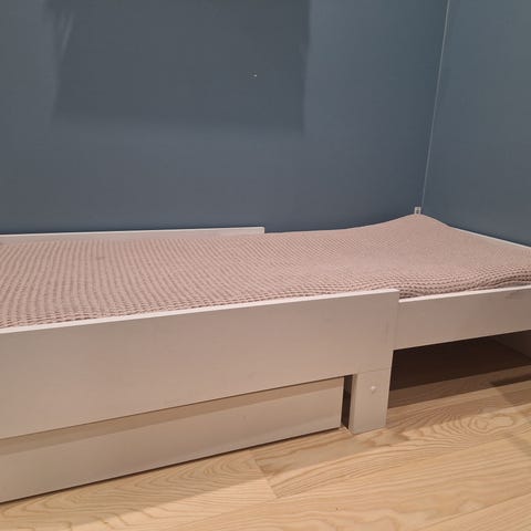 Sängyn leveys 86cm, pituus 105-220cm. Sopivam patjan leveys 80cm. (Nykyinen patja on noin 75×200cm.)