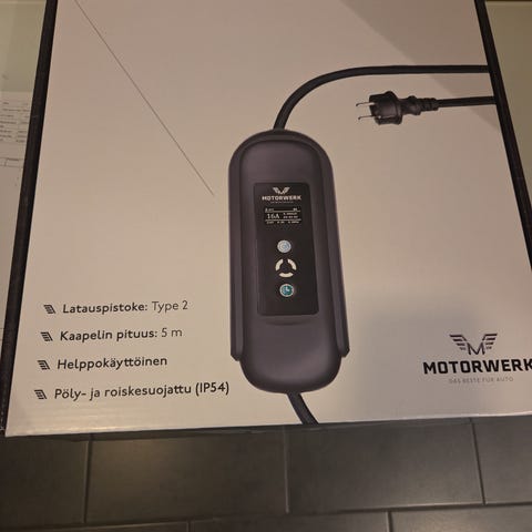 Latauslaitteen läpi on virrannut ongelmitta 5000 kwh ja johdon pituus riittää tarvittaessa vaikka naapurin tontille. Mukana ohjekirja ja alkuperäinen laatikko.