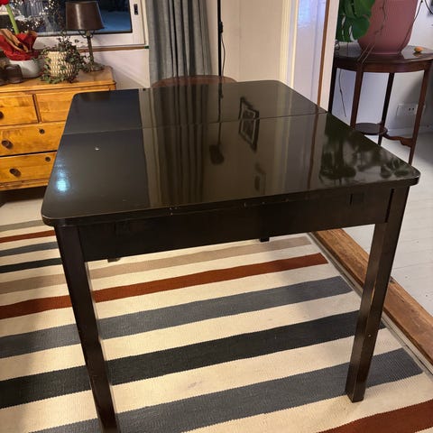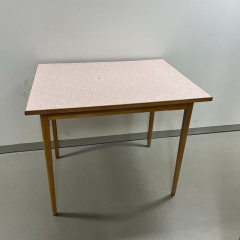 Erikoinen monikäyttöpöytä korotettavalla kannella: pöytä muuntuu hetkessä esimerkiksi sohva- tai kahvittelupöydästä pienen porukan ruokapöydäksi. Alkuperäiskuntoinen pöytä on 1950-luvulta ja tiettävästi lähtöisin Ruotsista. Rakenteet ja mekanismit ovat ehjiä, mutta maalipinta on huono ja kannen alta korotusvaiheessa löytyvä jatkopala on sävyltään hiukan muuta pöytää tummempi - jatkopalaa kun aurinko ei juurikaan ole päässyt haalistamaan. Mitat korottamattomana: 93 x 60 cm, korkeus 60 cm, mitat korotettuna: 131 x 60 cm, korkeus 70 cm. Pöytä painaa n. 10 kg. Asiallinen tapaus, mutta jos oikein siistiksi haluaa, tarvitaan uutta maalia! Kotiinkuljetus järjestyy samaan hintaan Tampereen tienoilla, kysy!
