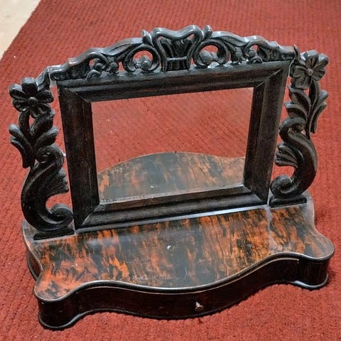 Vanha piianpeili. Säilytyslaatikko avautuu peiliksi. Mitat laatikkona L 34, S 28, K 10. Nouto Turun lähialueet.