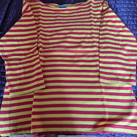 Samu-Jussi Kosken v2008 kokoelmasta kelta/valkoraidallinen v-aukollinen ohut viskoosi trikoopusero 3/4 hihoilla, 6 nappia edessä.
