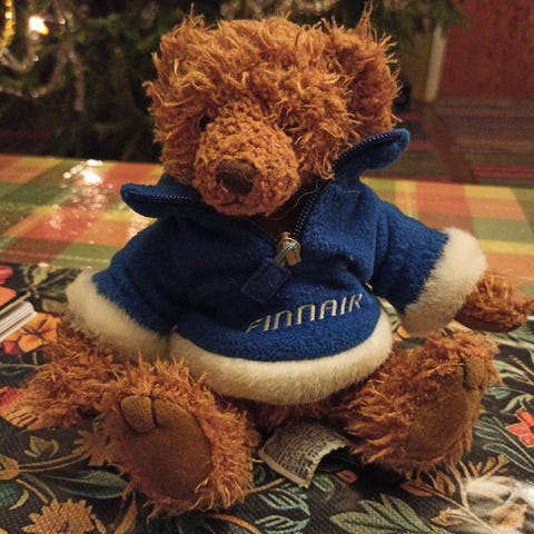 Siisti Finnair-nalle, ei tämä ihan uusi ole mutta en tarkkaan muista 10-15v heittäisin.