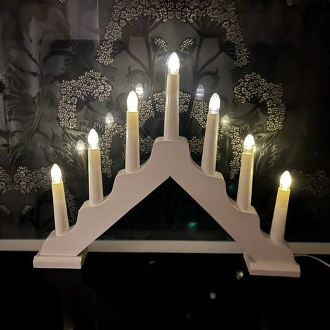 Tunnelma niminen kynttelikkö, jossa on puinen/puunvärinen kaari. 7 sähkökynttilää, kaikki 33v, 78mA, 2,61 W. Sähköjohdoista erillinen katkaisin, joten seinästä ei tarvitse irroittaa johtoa sammuttaakseen kynttelikön.
