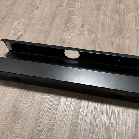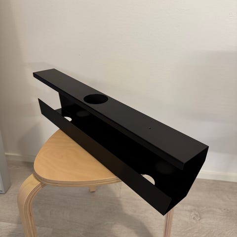 Myydään harmaa johtokouru työpöytään. Toisella seinällä avattava luukku. Mitat 80 x 14 x 15 cm. Päädyissä aukot johdoille. Tulee neljällä ruuvilla pöytälevyn pohjaan kiinni.
