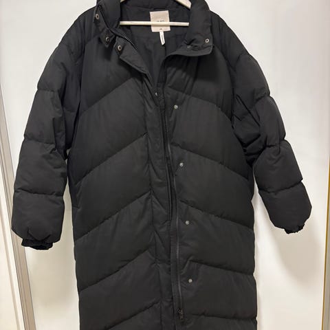 Musta, koko L. Iso huppu. Kaksisuuntainen vetoketju, piilopainonapit ja 2 taskua. Kerran kokeiltu ja todettu epäsopivaksi.