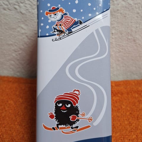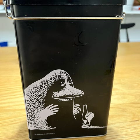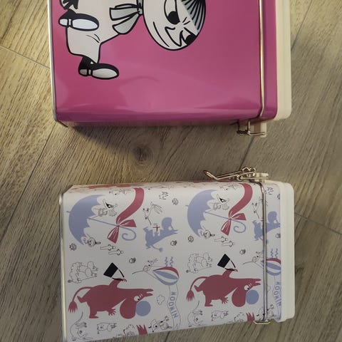 Muumi säilytysrasia metallia. Säilytysrasia on punainen ja siinä on musta kansi. Rasiassa on Muumi-aiheiset kuvat. Rasiassa on pieniä käytön jälkiä, kuten lommoja. Soveltuu kahvin säilytykseen.