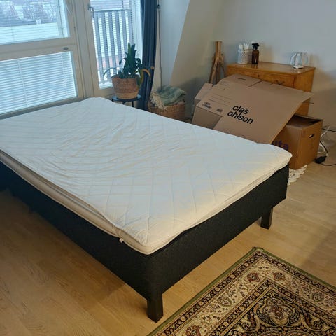 Sotkasta 1,5v sitten ostettu 120*200cm runkopatjasänky ja Jyskin memoryfoam patja. Mukaan myös Jyskistä ostettu patjansuojus. Sängyn jalat ovat tammenväristä puuta.