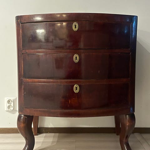 Vasta maalattu puulipasto. Laadukas, vankka. Vetimet uusittu myös. Toimii, siisti ja hajuton myös sisältä.