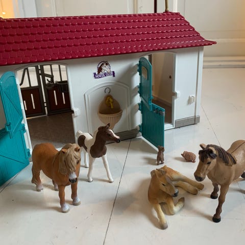 Schleich Hevostalli leikkisetti sisältää hevostallin rakennuksen, hevosen, koiran, ratsastajahahmon ja erilaisia tallitarvikkeita.