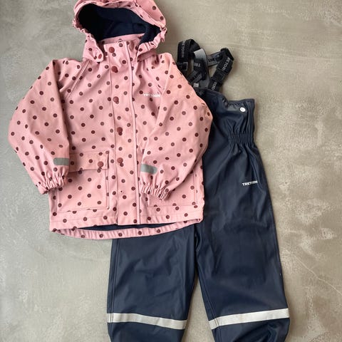 Laadukas fleece-vuorellinen sadeasu Tretorn-merkiltä koossa 98-104. Sävy tummanvihreä/tummansininen. Housut ovat haalarimalliset, ylhäällä tarrat joilla istuvuutta voi säätää. Jonkin verran kulumaa lahkeiden saumoissa (ks kuvat), mutta on pitänyt meillä veden. Takissa yksi painonappi irronnut, ei vaikuta käyttöön. Ei jalkalenksuja. Nouto tai postitus, en käytä Toridiiliä.