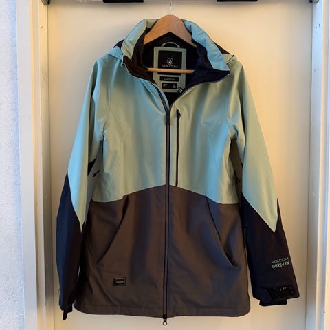 Volcom takki, värit vihreä ja beige. Takissa on vetoketjulliset taskut ja vetoketjullinen rintatasku. Koko m.