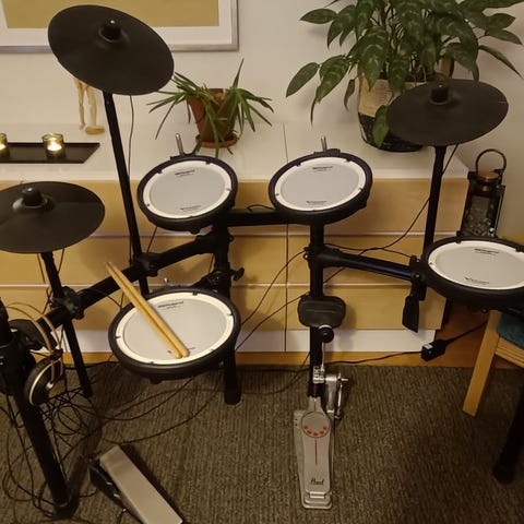 Rolandin TD9 sähkörummut mesh kalvoilla. Mukaan Taman rumpupenkki, basaripedaali ja rumpukuulokkeet.