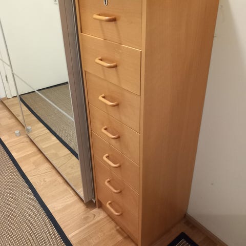 lipasto, jossa on kolme laatikkoa ja kaksi ovea hyllyillä