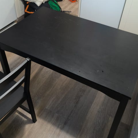 Myydään pöytä + 4 tuolia. Halutessaan saa mukaan 4 kpl lautasenalusia. Pöydässä ja myös tuolien selkänojissa näkyy käytönjälkiä. Pöydän jalat saa pois, joka helpottaa kuljettamista. Vain nouto.