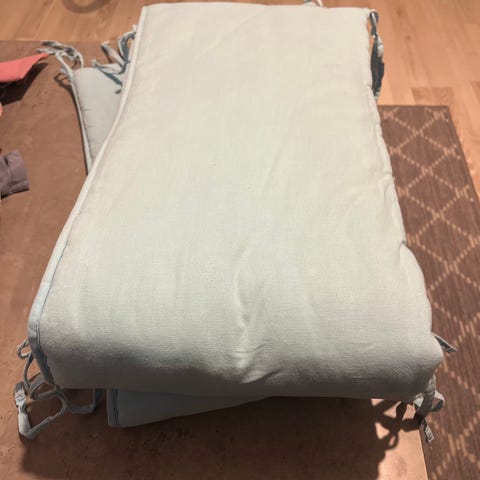 Seuraavalle pienelle pinnasänkyyn lakanoita, pussilakanat, suojalakanoita, tyynyliinoja, peitto ja tyynyjä sekä hupullinen boncho pyyhe.