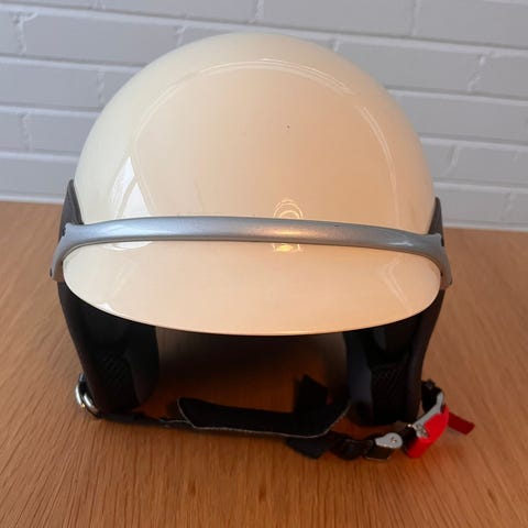 Vespa moottoripyöräkypärä harmaa. Kypärä on valmistettu Italiassa ja siinä on avonainen malli. Sisävuori on pehmeää nahkaa ja kypärässä on solkikiinnitys.