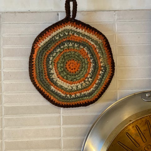 2x Kirjava kaksipuolinen virkattu pannunalunen. Eivät ole olleet käytössä
