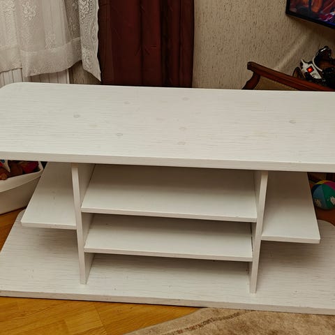 Pieni lasiovilla varustettu TV-taso haluaa uuteen kotiin.
