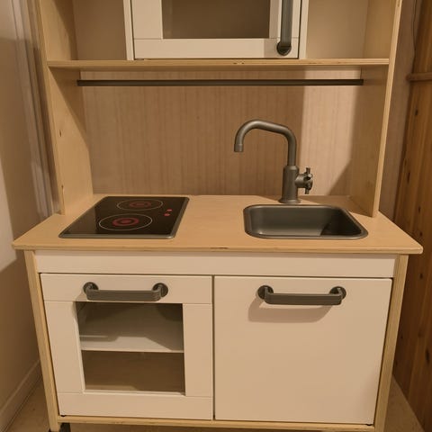 Itse tuunattu Ikean leikkikeittiö, käytön jälkiä löytyy mutta edelleen hieno. Mukaan tullee kuvassa olevat puiset lelut.