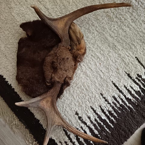 Taustalla varustetut aidot hirvensarvet.