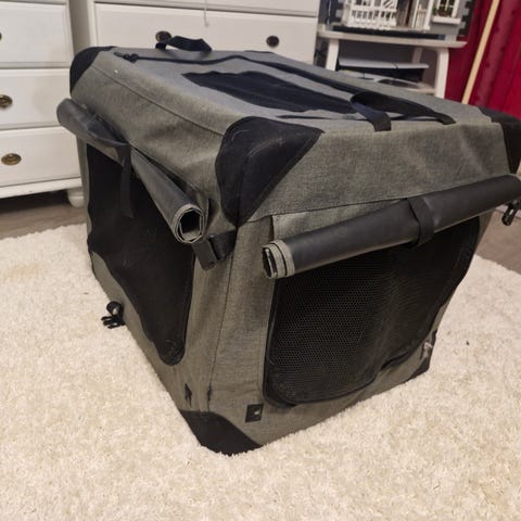 Myydään kankainen kevyt häkki koiralle. Menee kokoon eli helppo ottaa mukaan. Vähän käytetty. Väri sininen ja kuva ei vääristä väriä.
