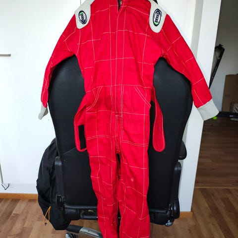 Karting-autoiluun ajopuku. Puvun koko 24. Lahkeen pituus 58/hiha 46/selkä 74. Kengät koko 34.