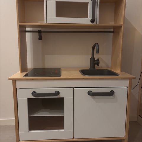 Hyväkuntoinen Ikea Duktig leikkikeittiö, toki jotain leikkimisen jälkeä voi näkyä. Yhdestä sisähyllyn reunasta pala lohjennut, ei haittaa leikkejä eikä juuri näy jos ei kaappiin kurki. Mukaan saa halutessaan sekalaisen läjän ruokatarvikkeita/astioita.