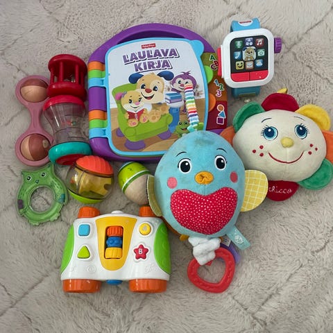 Mm chicco, fisher price leluja. Nuo yhdet on helisevöt sukat. V.sininen nalle on soittorasia. Joissakin pintanukkaa.