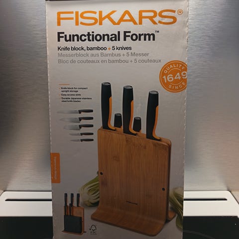 Uusi Fiskarsin puinen vankka veitsitukki. Vielä muoveissa. Viisi veitsen paikkaa ja kyljessä magneetti, jossa voi säilyttää vaikka saksia.