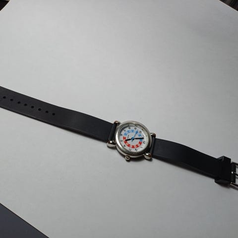 Hauska rannekello, vanha ranneke ei enää jousta. Pariston vaihto jää ostajalle.
