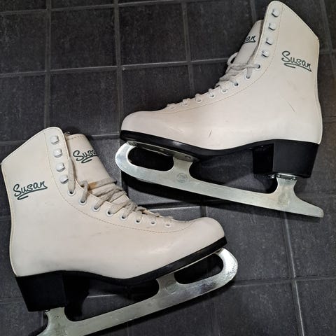 Lasten luistimet, koko 35. Viime talvena teroitettu. Nimikoidut.