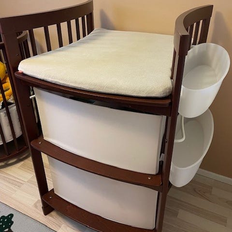 Stokke Home lipasto hoitotasolla. Erinomainen kunto, ollut toisessa kerroksessa todella vähällä käytöllä. Hoitotasolla pidetty aina pyyhettä tai muuta suojaa.