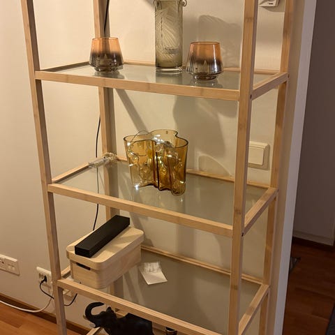 Laadukas Actona Company lasinen hylly. Tukeva metallinen rakenne ja puiset tasot. Lasiseinät jokaisesta sivusta takaa valoa sisälle. Neljä tasoa. Ovi sulkeutuu magneetilla. Alkuperäinen pakkaus löytyy ainakin osittain. Vain nouto, omat kantajat ja kyyti.