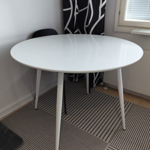 Vepsäläiseltä ostettu pyöreä ruokapöytä mustalla kannella ja puunväriset jalat. 110 cm halkaisija. Myydään muuton vuoksi.