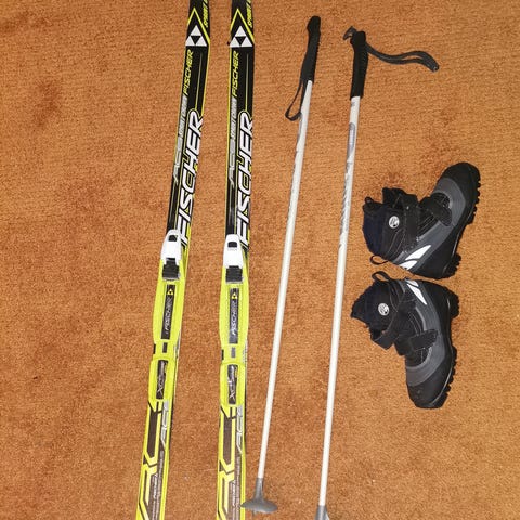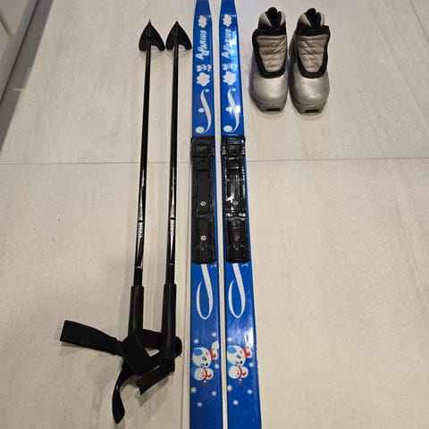 Lasten suksisetti. Suksien pituus 110 cm, sauvat 80 cm ja monojen koko 27.