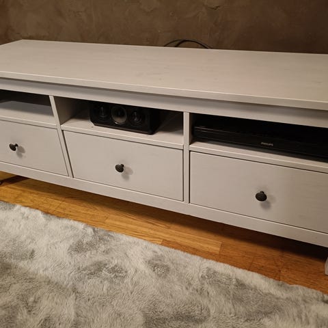 Ikea tv-taso, jossa mukana televisioteline. Tv-tasossa kaksi laatikostoa.