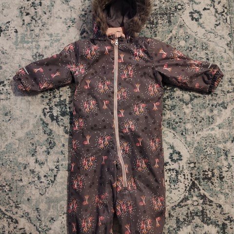 Hyväkuntoinen toppahaalari pienemmille pakkasille. Yläosassa fleecevuori. Polvissa hieman pehmentymää ja jalkalenkit kuluneet, muuten ehyt. Irrotettava huppu, jossa karvareunus (saa irti). Pesty hajusteettomasti käytön jälkeen. Koko 98cm.