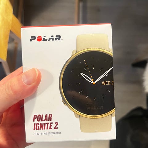 Polar Ignite 2 älykello, jossa on beige ranneke. Mukana latauskaapeli ja käyttöohjeet.
