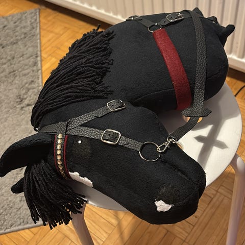 Käsintehty keppihevonen. En muista enää tekijää, mutta ainakin siihen aikaan keppihevospiireissä suosittu. Hyvä kunto, paitsi pieniä tahroja suun ympärillä ja kaulassa. Postitus ilman keppiä