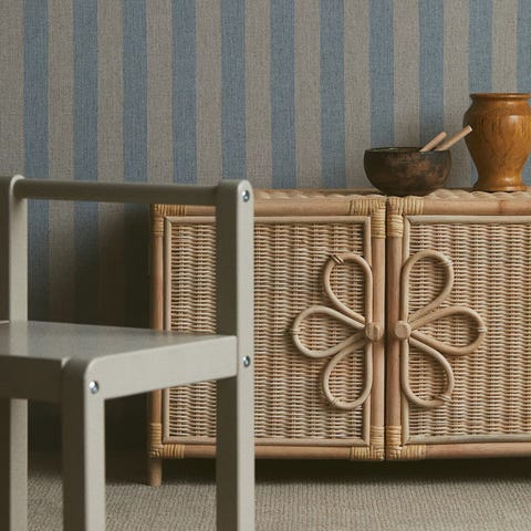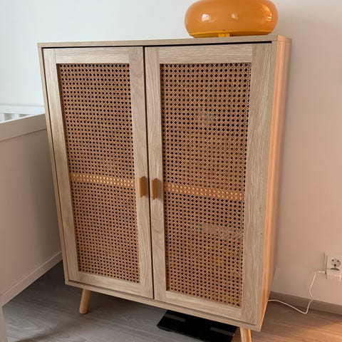 Aivan ihana kaappi jossa rottinkiovet. Sisällä kolme hyllyä.
