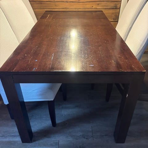 Tästä täyspuuta oleva pöytä ryhmä. Kunto välttävä, mutta menee vielä, pöydän pinnassa jotain jälkiä. Pöytä noin