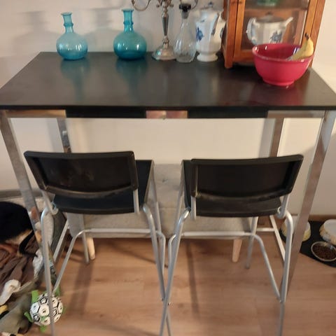 Myydään tarpeettomana pöytä ja 5 baarijakkaraa. 4 tuolia ovat identtisiä ja viidennessä on pehmustettu istuinosa. VAIN NOUTO!