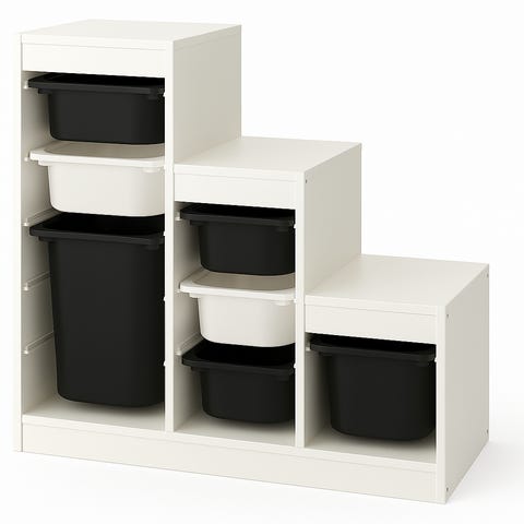 IKEA Trofast lastenhuoneen säilytysjärjestelmä/ säilytyskokonaisuus, jossa on vaaleaksi petsattu mäntyrunko ja värikkäät muoviset säilytyslaatikot.