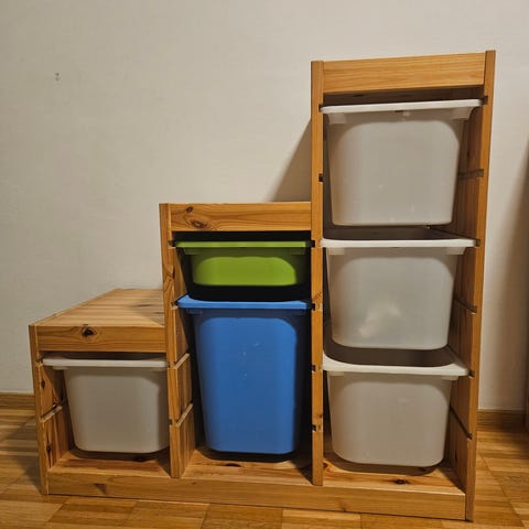 Hintapyyntöön kuuluu sekä runko että nuo kuvassa näkyvät säilytyslaatikot x8 kpl (2x keltainen matala, 1x vihreä matala, 1x valkoinen matala, 1x vaaleanpunainen matala, 1x vaal.pun. syvä, 1x punainen syvä sekä 1x vaaleanharmaa lokerikko). Osat neuvoteltavissa myös erikseen, joten saa tarjota pelkästä rungosta tai pelkistä laatikoista (1-8 kpl).