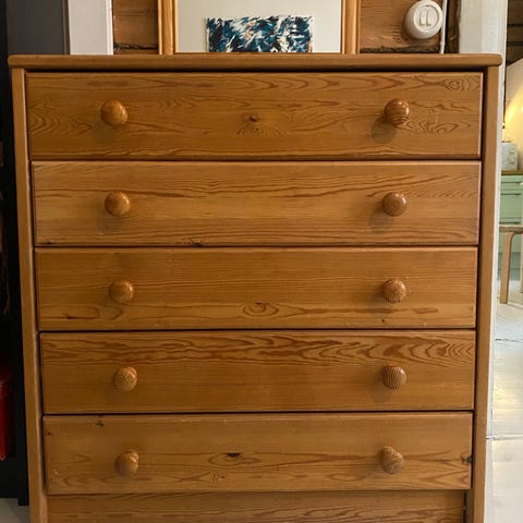 Väriltään pyökki. Ylälaatikossa, vähän vikaa, mutta menee kiinni.
