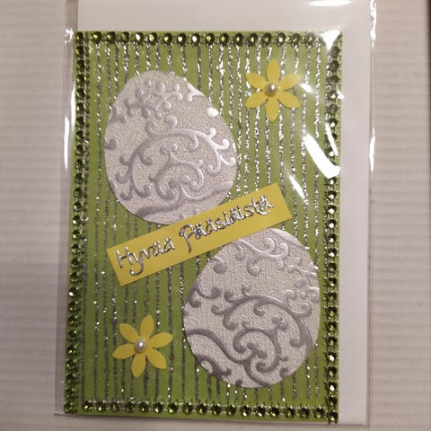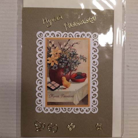 Itse tehty kaksiosainen pääsiäiskorttti jossa kirjekuori mukana. Hinta 2 euroa + postikulut ostajalle.