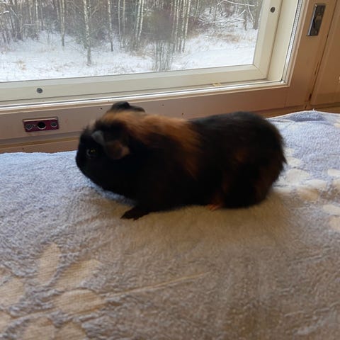 Melkein kokonaan mustan värinen uros marsu. Erittäin aktiivinen. Terve. Tottunut olemaan muiden marsujen kanssa. Söpö. Lyhytkarvainen.